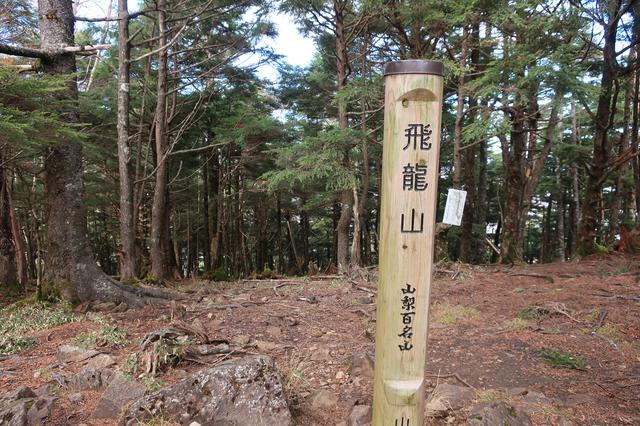 飛竜山は林の中、ついでにガスの中。苦労してきた割には見返りが薄く、ちょっとがっかり。