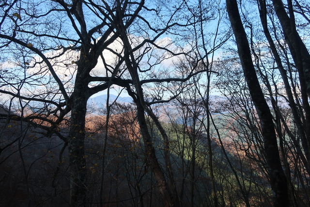 冬枯れの向こうに飛竜山(左)と雲取山(右)が見えている。森が明るいのと遠くまでよく見えるのが枯れ山のいい所。
