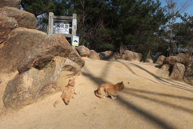 風吹岩と定番の猫。風吹岩には、ちょうどロケでアルミカン(芸人)が来ていた。「うわー、きれいー!」「すごい!絶景ー!」って言ってたけど、ロケを盛り上がるために言ってるのか、それとも普段山に縁がないのでこれくらいで絶景に感じるのか、、、。夕方、街の明かりが灯っていく頃であれば最高だけど、昼下がりだと個人的な評価としてはちょっと良いくらいかな。