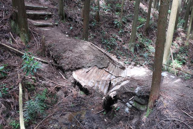 崩れた橋。渡るのは危ないので脇に迂回路がついている。川幅は1mもなし、むしろ、なぜ橋を架けたのか。