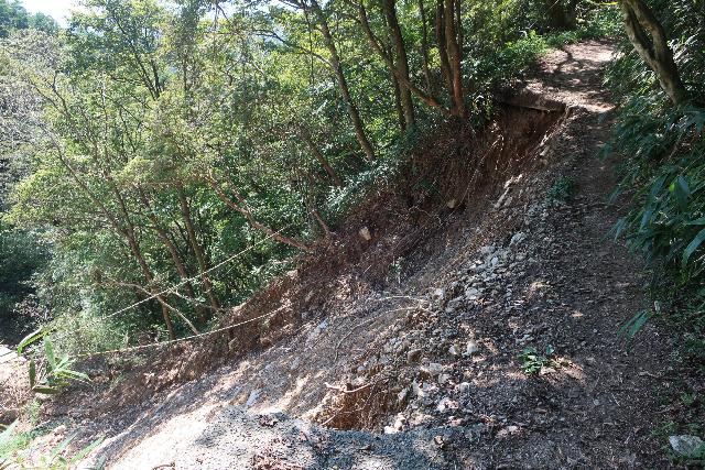 これが原因。路肩は残ってるし、斜度は緩いし、落ちても死にはしないだろう。老若男女、いろんな人が通るから、念の為ってところでしょうか。