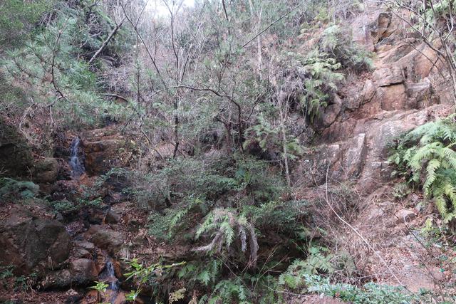 左が奥高座の滝。で、右の崖が登山道。道の方が滝より急なんだけど、、、。