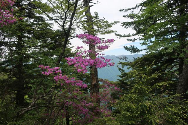 ところどころ咲いているツツジ。奥に見える山はどこかなぁ。2500mくらいはありそう。