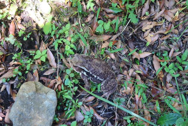 中央、こぶし2つ分はある巨大なカエルなのだが保護色でわかりにくい。