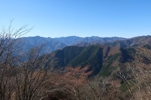 川苔山から。中央は雲取山。手前から二番目の尾根が登ってきたヨコスズ尾根。右端に連なる尾根をたどってここまで来た。