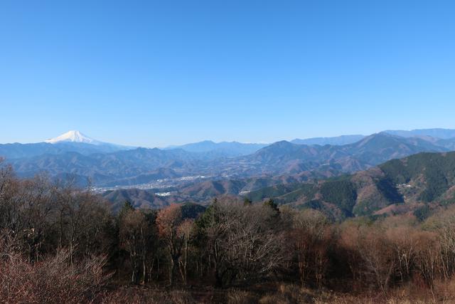 右側の2つ連なった山が先週登った扇山と権現山。扇山の左の覗いているのは南アルプス、悪沢岳と赤石岳。