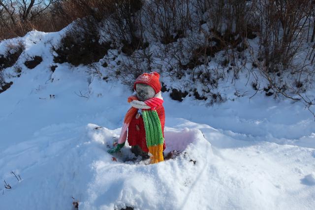 雪の中、なんだか暖かそうなお地蔵様。サンタクロース仕様?仏教とキリスト教のコラボレーション。