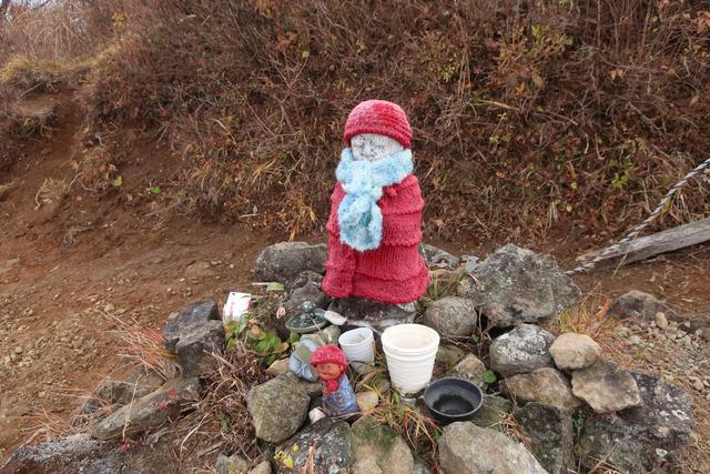 見るたびに拡張されていく三ノ塔のお地蔵様。今回新たに増えたアイテムは水色のマフラー。