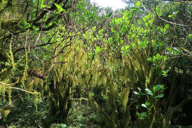 苔が枝から藤の花のように垂れる。火口内は湿原地帯で水蒸気に溢れているのであろう。