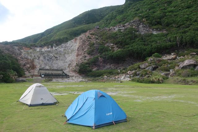キャンプ場は芝に覆われていて快適。ただ、ヤギの落し物は結構ある。奥に見えるのは砂風呂施設なんだけど作りっぱなしでほったらかしなのか、ちょっと利用しようという気にはならない。キャンプ場の手前に露天風呂もあるんだけど、こちらも整備されていないので入れる状態ではなかった。もったいないなぁ。