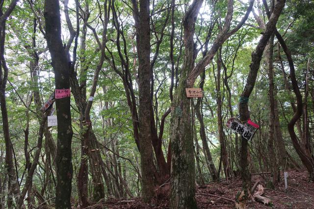 雪池山は展望なし。何故か手作りの標識がたくさんあった。