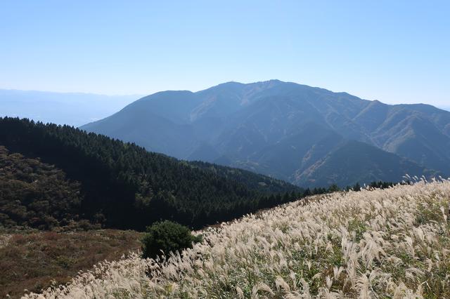 葛城山頂もススキ原。目の前の金剛山。間に横たわる水越峠。一度全部降りてもう一度登るのはそれなりに大変。
