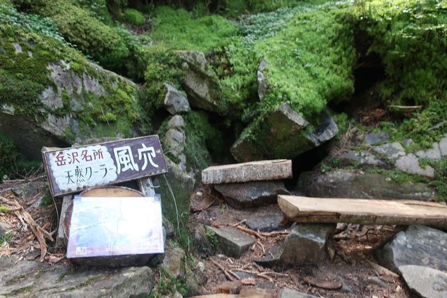 岳沢名所(そう書いてある)風穴。地中から冷たい風が流れ出る。が、そもそも、1500m以上の高原だ。どこも涼しい。ついでに200mほど下にたくさんの穴が空いている所があり其処の方が涼しい。