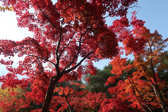 瑞宝寺公園の真紅のモミジ。見上げて撮った写真。公園内は観光客がいっぱい。