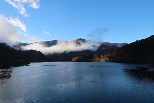 奥多摩湖、ダムの堰堤から。清澄きわまる空に低い雲。