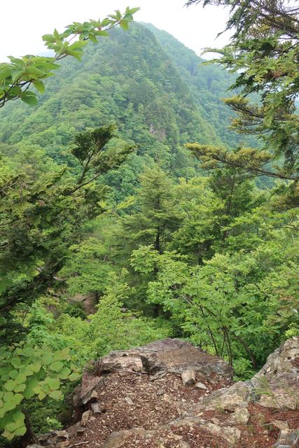 大持山を振り返る。見てわかる通り両側急谷。等高線も超密。道はこの尾根上にあります。木々に覆われているのでそれほど怖くないけど、見通しが良ければ足がすくんでいたはず。
