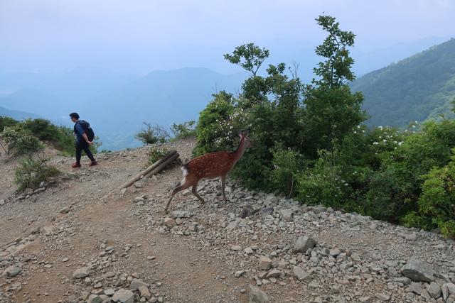 あらっ、びっくり。すぐ隣のヤブから出てきた。ほんの目の前を(50cmくらい)を通り過ぎて再びヤブに消えた。一瞬の出来事。たくさんのハイカーの通る大倉バカ尾根だが鹿に気づいたの私一人。