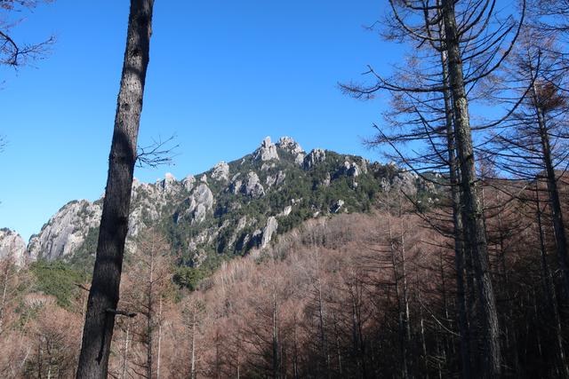 岩峰が露出していて格好いい山容。中央2つ岩峰の右側が山頂。