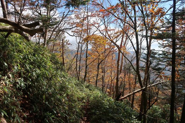 奥秩父縦走路は笹薮が続く。笹に覆われた道は状態がよくわからず怖い。ついでに、笹の露を受けて下半身はビショビショ。この後、5時間、靴はずっと濡れっぱなしだったので、バス停に着いたときには足の指がふやけていた。