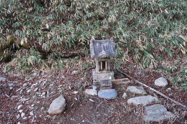 縦走路を外れて下山路へ。途中で見つけた飛竜権現。山はでかいけど、神様の家は小さい。無事下山できることをお祈りする。