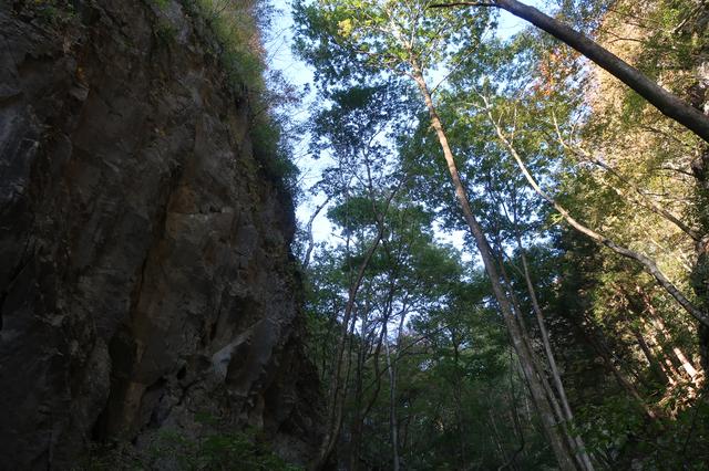 左が切り立っている、稲村岩の脇を登山道が続く。