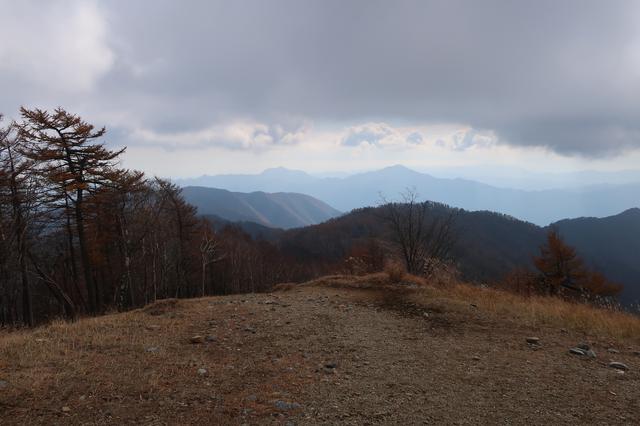 鷹ノ巣山山頂から。景色はいいんだけど、厚い雲が垂れ込めている。晴天なら最高だろうなぁ。