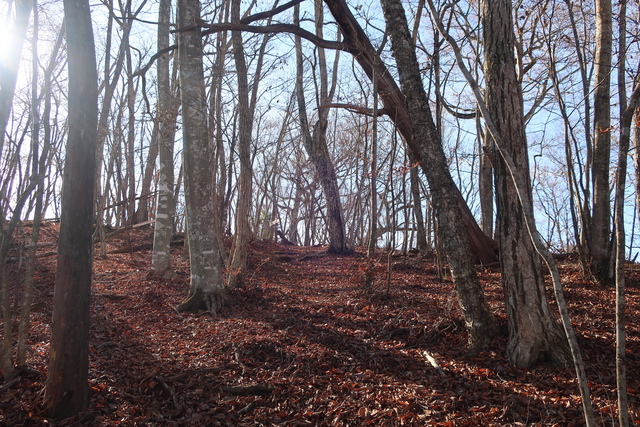 冬枯れのブナ林。朝日が眩しい。深山橋バス停で降りたのは私一人だけ。今日この尾根(ムロクボ尾根)は独り占めである。三頭山は人気の山で登山道もたくさんあるから山頂は人だかりだろうけど。