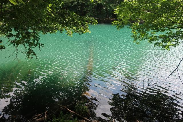 オンネトーは幻想的な色合い。水没した倒木が朽ちずに水面で揺れている。