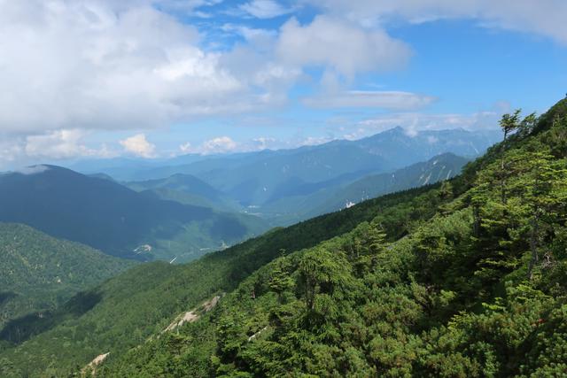 穂高大権現を越えたコルは樹木もなく見通しが良い。来し方平湯温泉を望む。