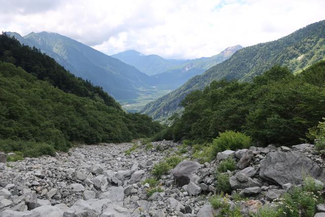岳沢小屋付近から上高地。午後は雨の予報。だいぶ雲が多くなってきた。