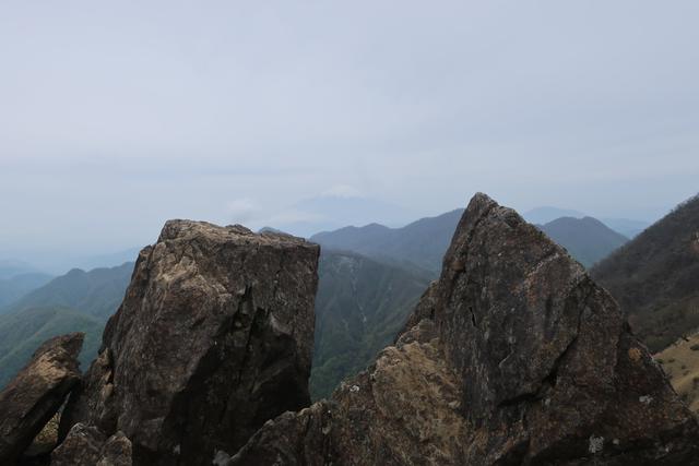 こここは有名なポイント。2つの岩の隙間に富士山を望める。霞んでいてよくわからない。