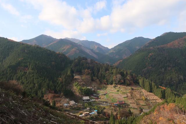 広く伐採されたエリアがあり三頭山を見上げることが出来た。おそらく左の峰の少し右、遠く少し霞んでいる所が頂上と思われる。