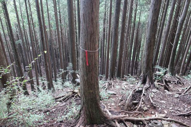 踏み跡だらけでわかりにくい尾根道。地図にないのでテープが目印。これは道迷いが多発しますわ。