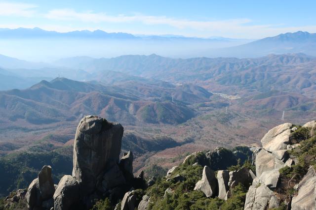 クライミングで有名な大ヤスリ岩と広がる奥秩父の山麓。奥には南アルプス。さらに向こうは中央アルプス。