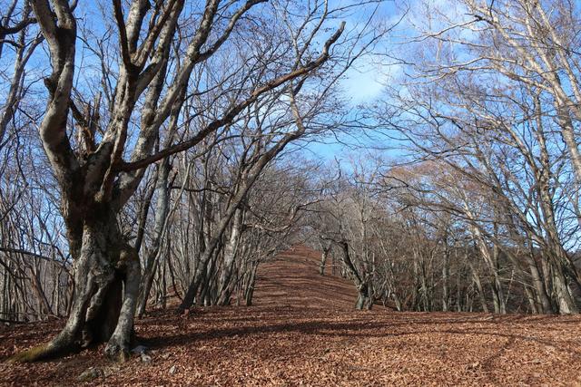 陽気な青空ながら、陰気な冬枯れの森。左の巨木が誘う、「ようこそ霊気あふれる幽玄の世界へ。」進めば吸い込まれて引き返せなくなりそうだ。魂の一方通行。