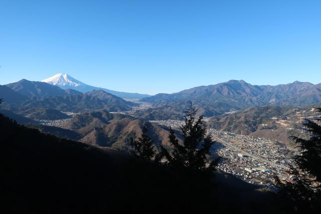 九鬼山の天狗岩から。右の山々が三ツ峠山。富士山の真正面で素晴らしい展望なのだが1700m越えで寒すぎるので断念。