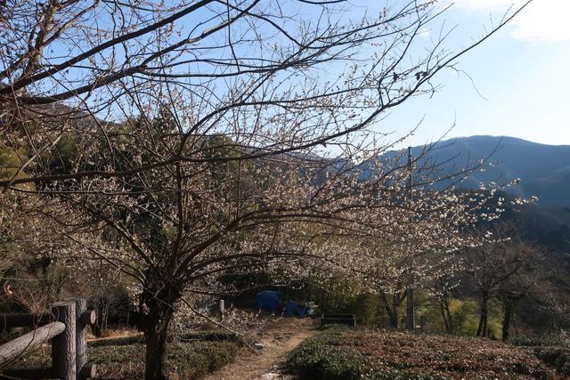 登里集落の梅。右がゴールの陣馬山。陣馬山には背を向けて反対の尾根の登るので非常に遠回りして行くことになる。