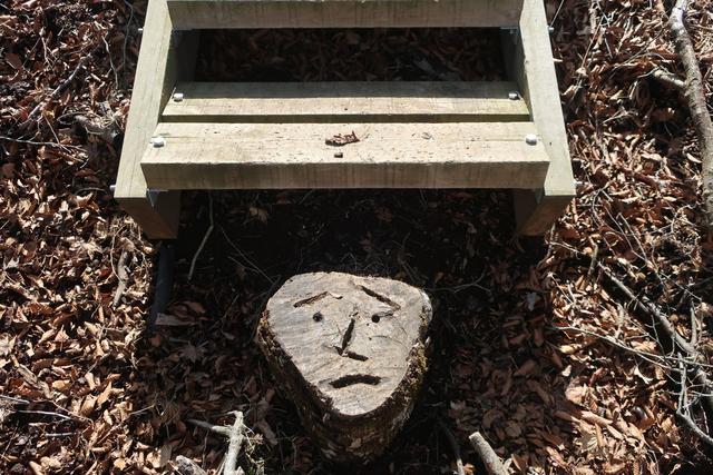 丹沢によくあるステップに刻まれた絵。ステップなんで足場として踏むんだけど、なんだか悪い気がする。困ったような顔してるし。