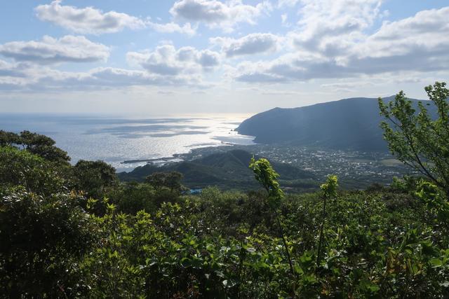 朝日を浴びる底土港。写真中央部分が寝泊まりしている底土キャンプ場。