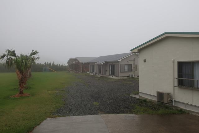 本日は雨。手前から学生寮、交流館、保育園。新しい建物ですね。ちなみに前は学校でそちらも綺麗でした。